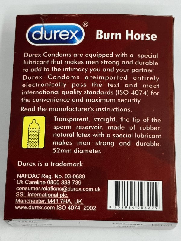 Original Durex Condom: Choosing an original Durex burn horse condom ensures that you are getting a genuine product that meets the brand's strict quality standards. Always look for the Durex logo and packaging details to ensure authenticity and reliability.