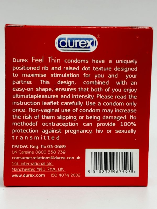 Durex Condoms Feel Thin Quality: Condoms are made from premium quality latex materials, ensuring strength, flexibility, and Super Thin natural feeling during intimate moments.