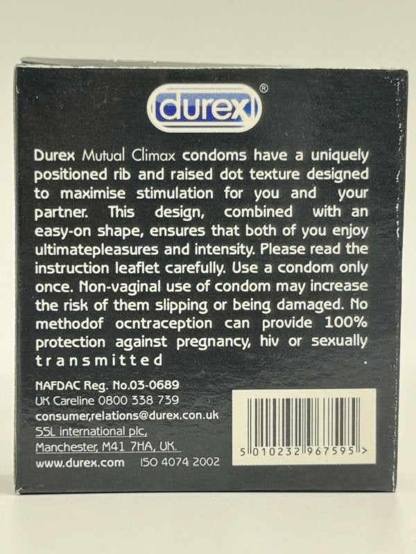 Durex Condoms Mutual Climax Quality: Condoms are made from premium quality latex materials, ensuring strength, flexibility, and Stimulating during intimate moments.