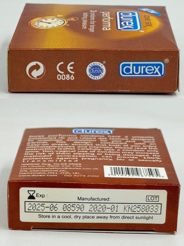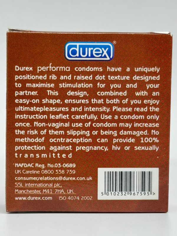 Original Durex Condom: Choosing an original Durex Performa condom ensures that you are getting a genuine product that meets the brand's strict quality standards. Always look for the Durex logo and packaging details to ensure authenticity and reliability.