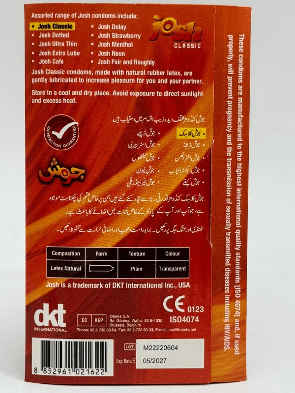 Josh Condoms Quality: Josh condoms are manufactured to the highest international standards(ISO 4074) made from premium quality latex or non-latex materials, ensuring strength, flexibility, and sensitivity during intimate moments.