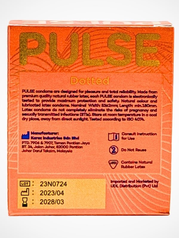 PULSE dotted condoms are designed to increase sensation and pleasure for both partners with reliability. Made of premium quality natural rubber latex, each PULSE condom is electronically tested to provide maximum protection and safety.