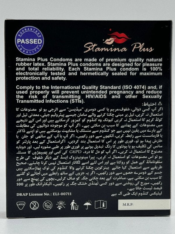 Stamina Plus Condoms Quality: Stamina Condoms are made from premium quality latex materials, ensuring strength, flexibility, and sensitivity during intimate moments.